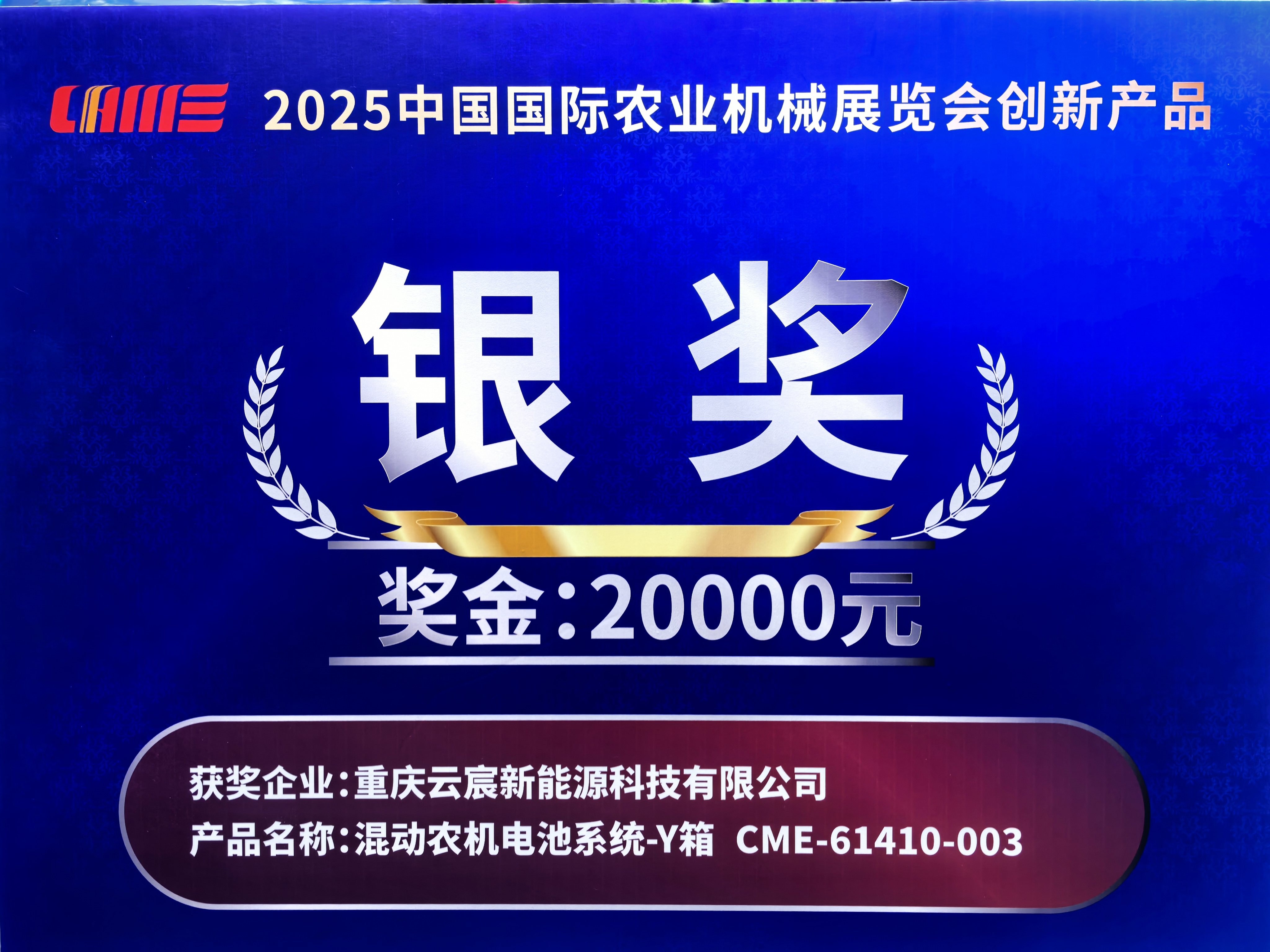 开幕式前,首先举行了“2025中国国际农业机械展览会创新产品发布”。重庆云宸新能源科技有限公司(简称“重庆云宸”)的混动农机电池系统-Y箱,凭借其领先的峰值30C超高充放电倍率和40000次超长循环寿命,及卓越的市场应用表现,一举斩获“创新产品银奖”!