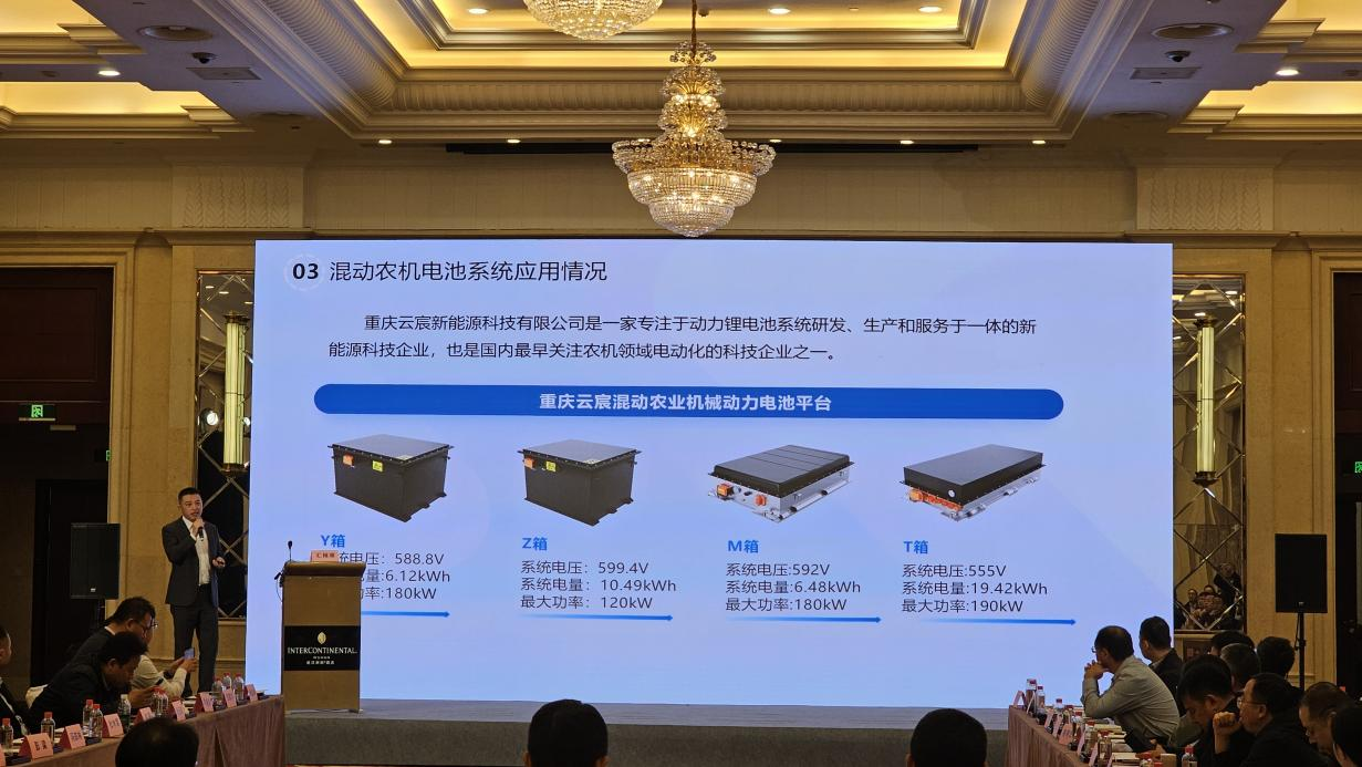 重庆云宸新能源科技有限公司(简称“重庆云宸”)总经理马兹林应邀参加会议,并在会上做主题为“混动农机专用动力电池特点及应用”的主旨发言。