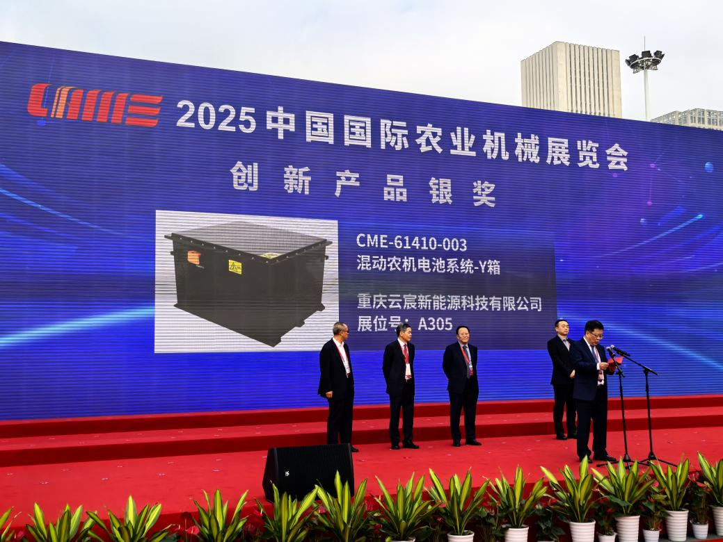 10月份举行的“2025中国国际农业机械展览会”上,重庆云宸向行业展示了全马力段、多种作业类别覆盖的动力电池产品矩阵。展览会上展出的新能源农机,重庆云宸动力电池配装率超60%,其中混动农机配装率更高达80%。在创新产品评选中,重庆云宸Y箱混动电池系统荣获“2025中国国际农业机械展览会-创新产品银奖”,充分彰显其作为“新能源农机动力电池系统解决方案领导者”的底蕴。