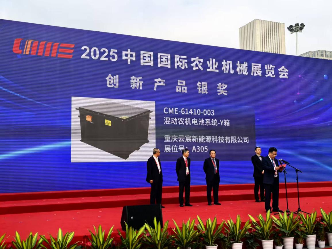 开幕式前,首先举行了“2025中国国际农业机械展览会创新产品发布”。重庆云宸新能源科技有限公司(简称“重庆云宸”)的混动农机电池系统-Y箱,凭借其领先的峰值30C超高充放电倍率和40000次超长循环寿命,及卓越的市场应用表现,一举斩获“创新产品银奖”!